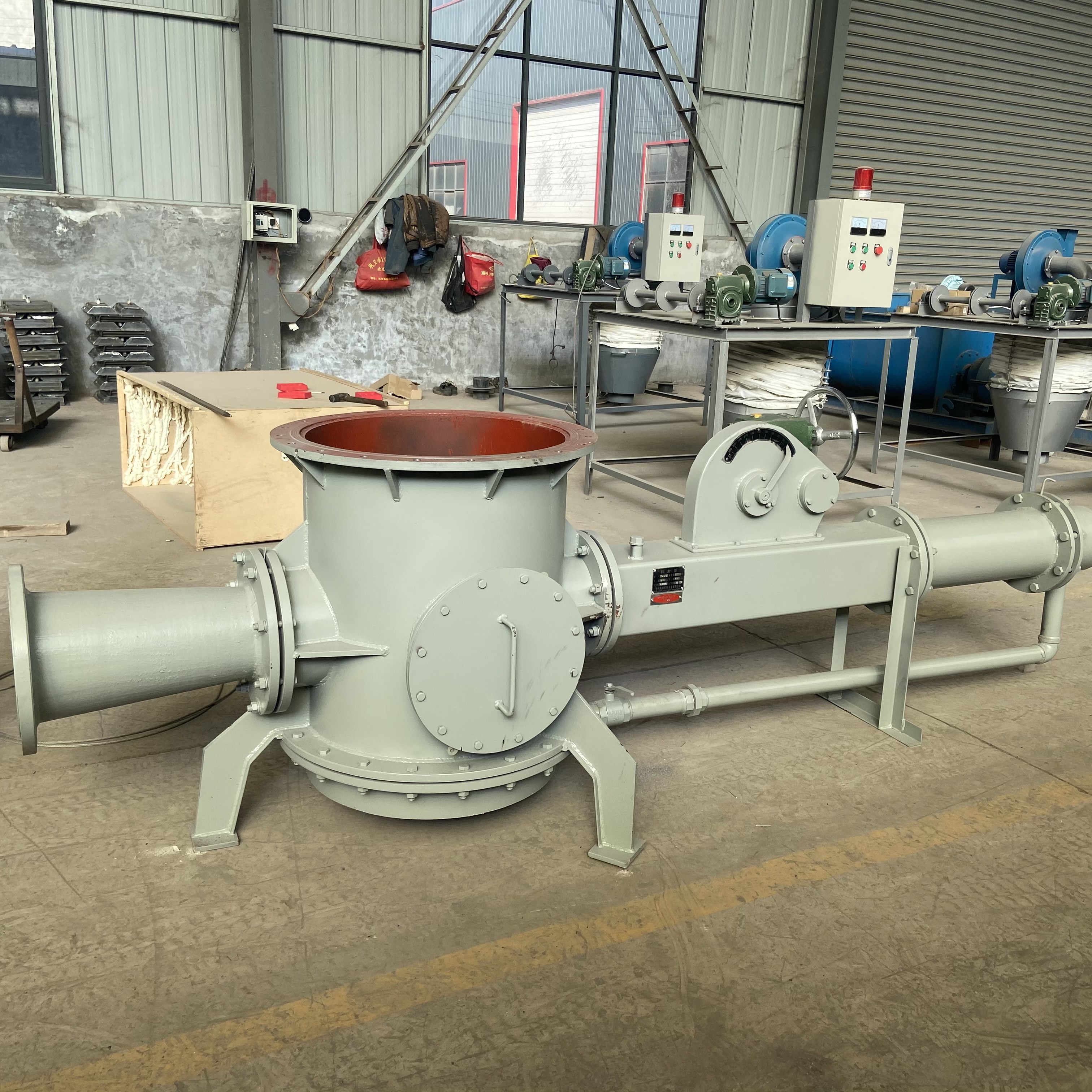 氣力輸送泵由擴(kuò)散室、泵體、活動風(fēng)管,執(zhí)行機(jī)構(gòu)等部分組成。低壓空氣經(jīng)進(jìn)風(fēng)管、泵體,進(jìn)入擴(kuò)散室。高速氣流通過泵體時(shí)把噴嘴周圍物料氣化,噴嘴進(jìn)入擴(kuò)散室的氣流在噴嘴與擴(kuò)散室形成局部負(fù)壓,把氣化物料吸入輸料管,被高速氣流提升到卸料點(diǎn)。